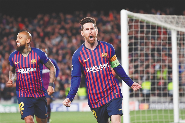 北京时间3月14日凌晨,在欧冠联赛1/8决赛次回合比赛中,西甲巴塞罗那队主场以5:1战胜法甲里昂队,以总比分5:1晋级八强。图为梅西(右)进球后庆祝。 新华社发