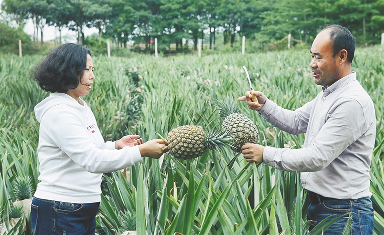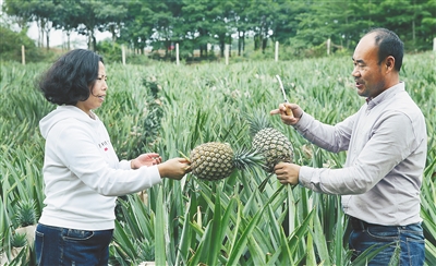 “看!自然熟的凤梨就在这儿!”果农李晓展一边说着,一边麻利地割下一颗凤梨来,只见青色果皮中透着黄色。切开品尝,甜香的滋味便萦绕在唇齿间,让人回味。