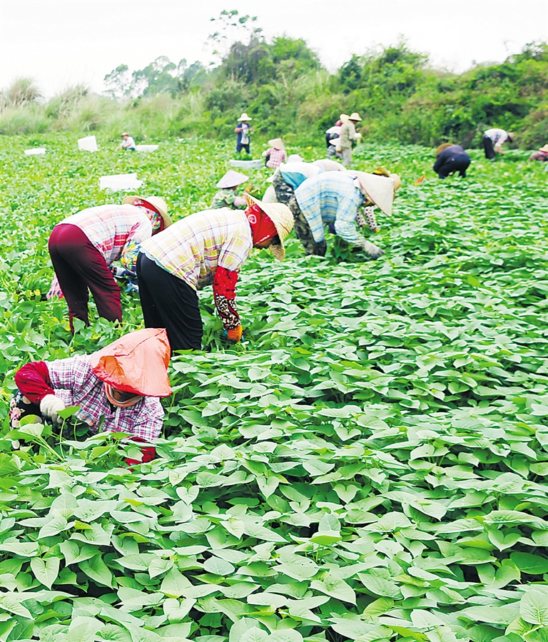 在离李晓展果园的不远处,金江镇名山村的绿色田洋里,也是一片繁忙的场景。种地瓜苗、收地瓜叶在不同地块同时进行。“去年已经种了120亩,但还远远不够,今年打算进一步扩种。”种植大户黄家万说。