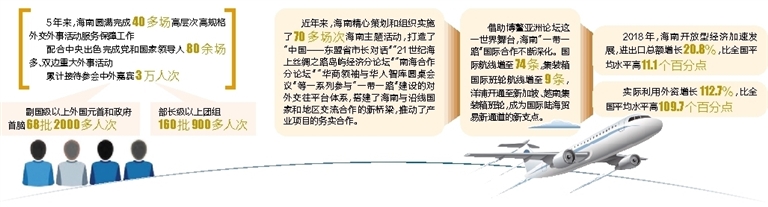 路径明晰,前途光明,脚下的路更要一步一个脚印。这些年来,充分做好历届博鳌亚洲论坛年会以及澜沧江——湄公河合作首次领导人会议、中非合作圆桌会议、中国——中亚合作对话会、中国——中东欧国家合作国家协调员会议等40多场高规格外交外事活动的服务保障工作,只是海南服务国家总体外交、扩大开放的一部分。在此过程中,海南坚持“引进来”与“走出去”,不断扩大发挥博鳌亚洲论坛等外事活动的效应,加强与客商的对接,近5年来策划和组织实施了70多场次海南主题活动。