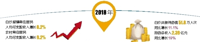 “文体+旅游”的发展模式丰富了白沙旅游方式和内涵,也有效拉动了白沙的县域经济,促进了经济发展方式的转变。据统计,2018年白沙全县经济社会保持稳中有进、进中向好的发展态势。其中,城镇、乡村常住居民人均可支配收入分别增长8.2%和9.2%;全年共接待游客51.8万人次,同比增长11.1%,旅游总收入2.39亿元,同比增长19%。