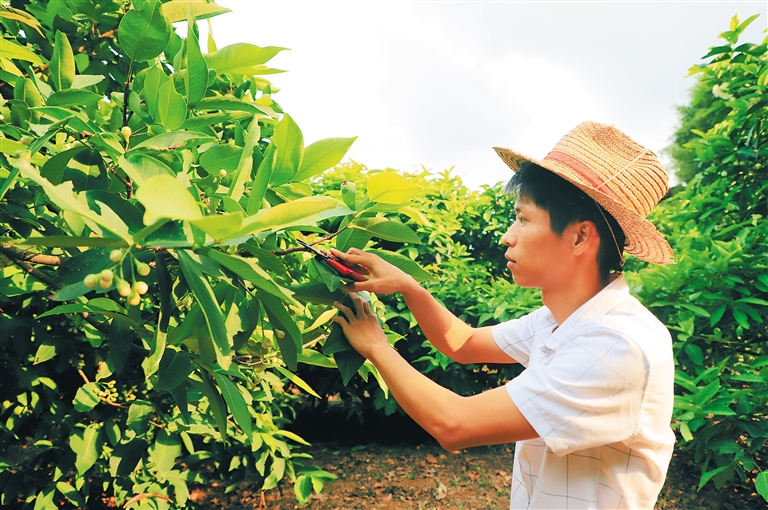 32岁的谢镇登,高瘦,腼腆,笑容真挚,穿着短袖衫和运动鞋的他,看起来并不像农民。可他戴上草帽,拿着剪刀,在莲雾园里修建枝条的动作,又是如此熟练。