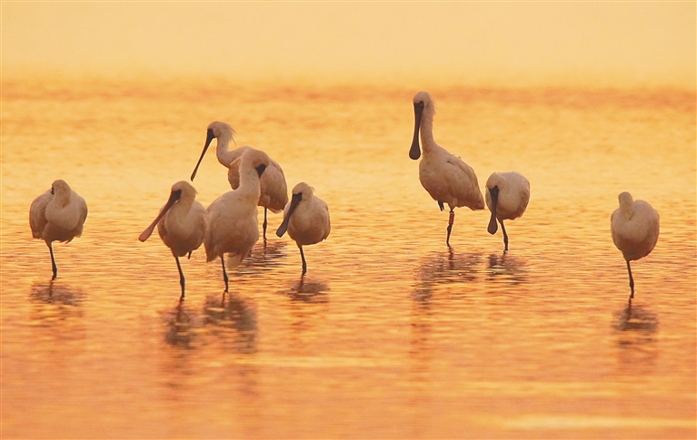 比如,黑脸琵鹭这个把黑白经典配色穿在身、有着大长腿的“模特儿”,走起路来不像静态图片那般优雅,反而稍显笨拙。还好,它们在夕阳映红一汪水面上单足站立、临泽理羽的倩影,为其肩负的优雅之名扳回了分数。