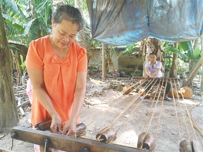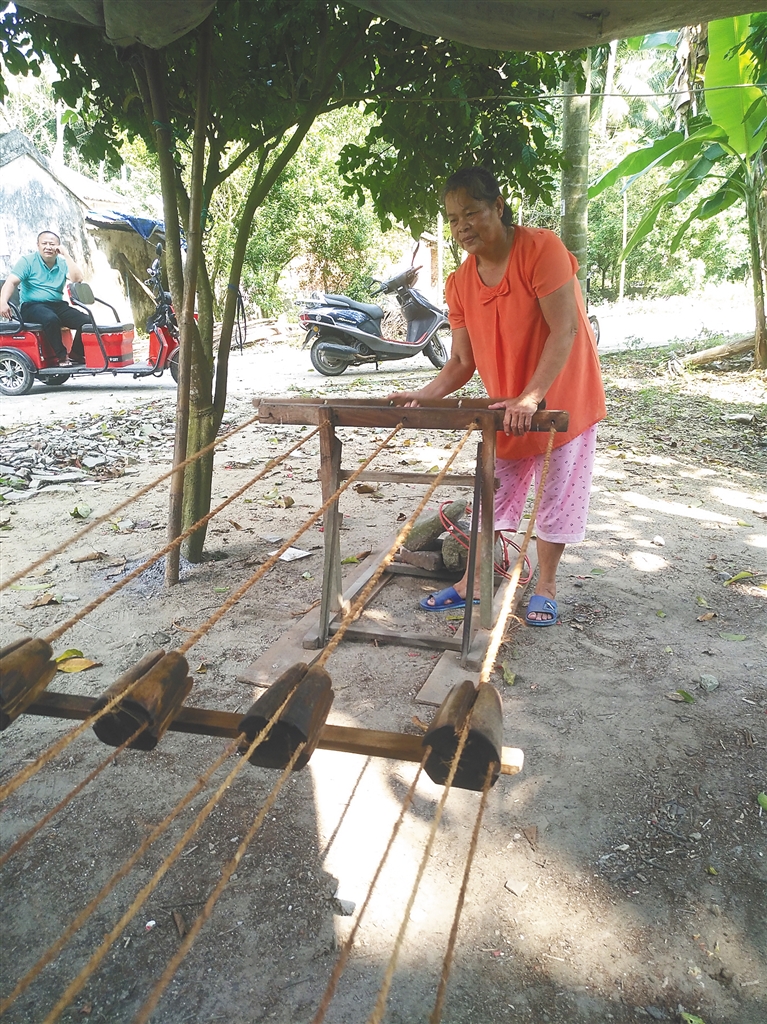 在黄菊英符致文夫妇专注做椰棕绳时,庭院间安静得可以听见风吹树叶“沙沙”的声音,制绳的木质器具发出有规律的“锵锵”声。黄菊英说,以前最忙的时候,他们曾连夜赶工,不时能看见萤火虫在周围飞舞。