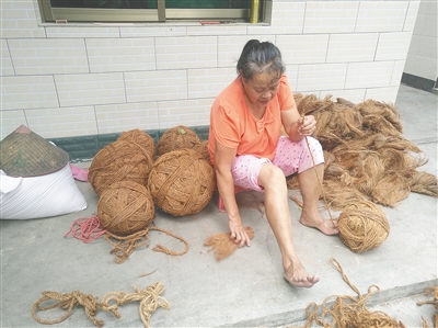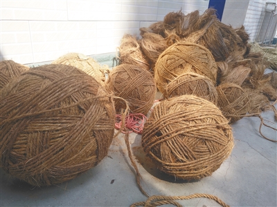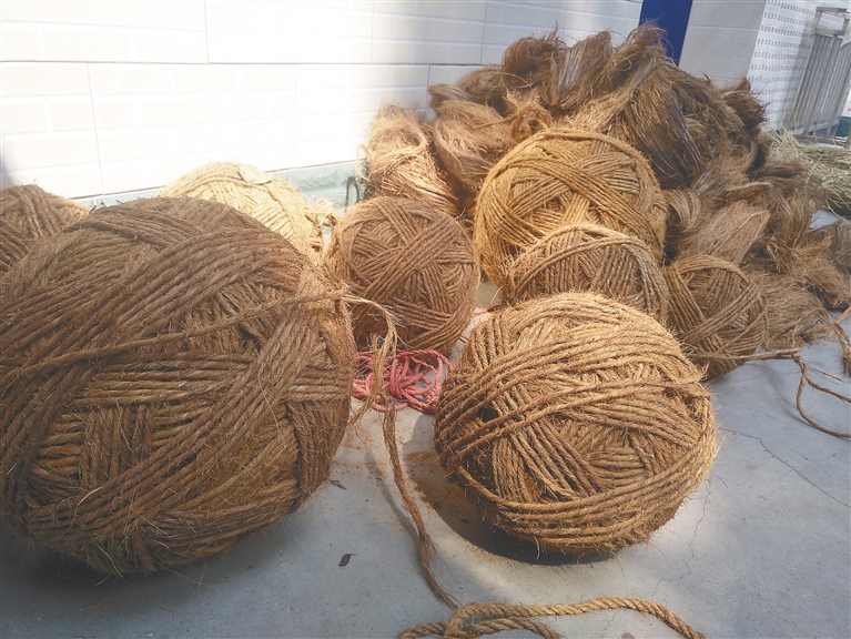 “以前椰棕绳的应用广泛,搓绳子能卖钱补贴家用,所以一般的家庭都会叫稍大懂事一点的小孩帮忙呢。”符致群告诉记者,椰棕绳可以捆秸秆、可以做拴牛绳、还可以在庭院里挂东西。虽然用途广,但因为不经处理的天然椰棕易腐烂、易断,所以过一段时间就需要更新,这样,人们对椰棕绳的需求量就很大。上世纪五六十年代,东郊椰林片区几乎家家户户都会利用闲暇时间手工制作椰棕绳。