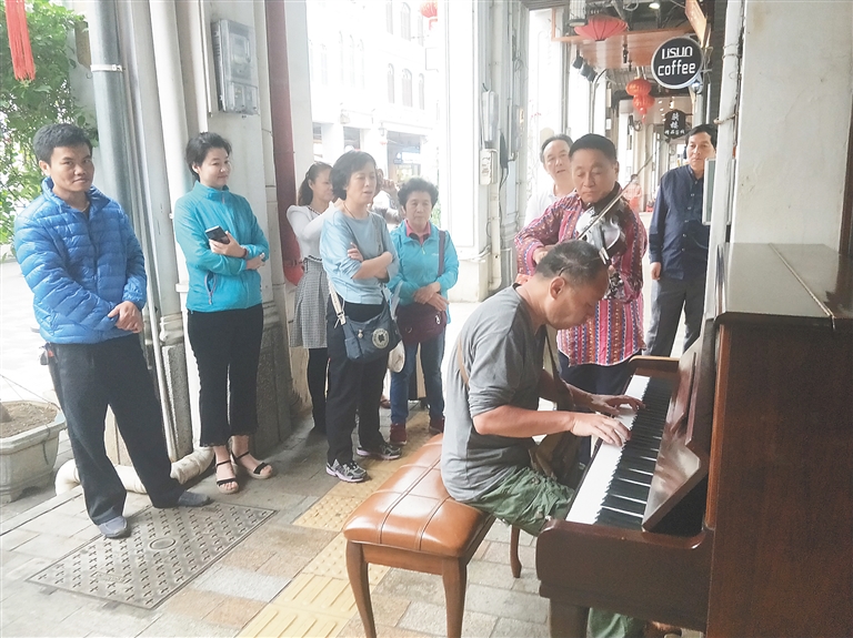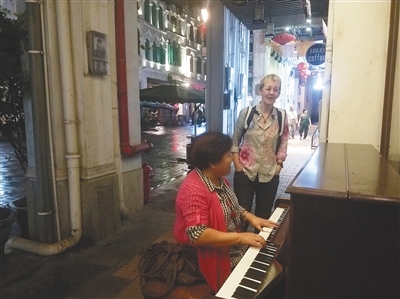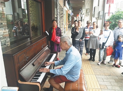 充满历史沧桑感与异域风情的骑楼老街街角,经常飘扬着钢琴声,有时是肖邦的乐曲,有时是经典老歌,有中国歌曲,也有外国歌曲;时而还有歌声和着钢琴声,更多的时候是随意的音符在飘荡。闻声而去,原来街角放了一架钢琴,演奏者常常是路过的行人。