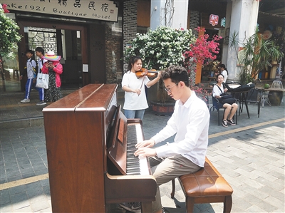 “很多国际友人看到这架钢琴都很激动,有位从爱尔兰来的女士还跟一位中国女士一起即兴表演呢,中国女士弹琴,爱尔兰女士唱歌,演唱结束后,好多人围着鼓掌。”民宿工作人员田倩很关心这台钢琴的故事,她在民宿前台工作,听到琴声响动,就会跑出来看看。“还有一位十来岁的小男孩,他是我们民宿的客人,钢琴演奏技巧很高超,他说街头钢琴很好玩、很有趣。”