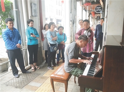 田倩回忆道,钢琴放在这有快一个月了,因为地处骑楼景区,往来游客多,再加上街头钢琴很有文艺范,很多人都在社交媒体上发照片、发视频,逐渐吸引一些人“有备而来”。这些人大都“身怀绝技”,有的甚至会邀上乐友一起演奏,就像是“网红打卡地”一样,玩的就是气氛,俨然已成为老街新景。