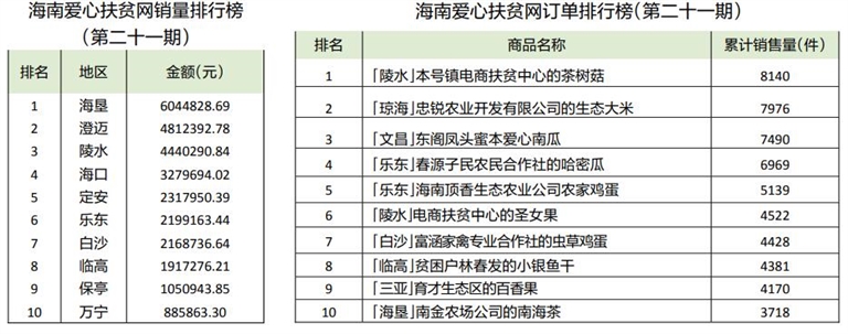 榜单揭晓,优惠不断!记者了解到,为了更好地帮助贫困户销售农产品,同时也回馈消费者,海南爱心扶贫网将推出多款优惠农产品。