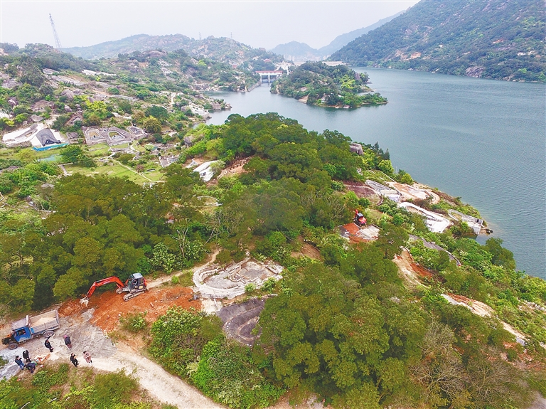 3月31日,工作人员在福州市长乐区三溪水库边整治违建坟墓。