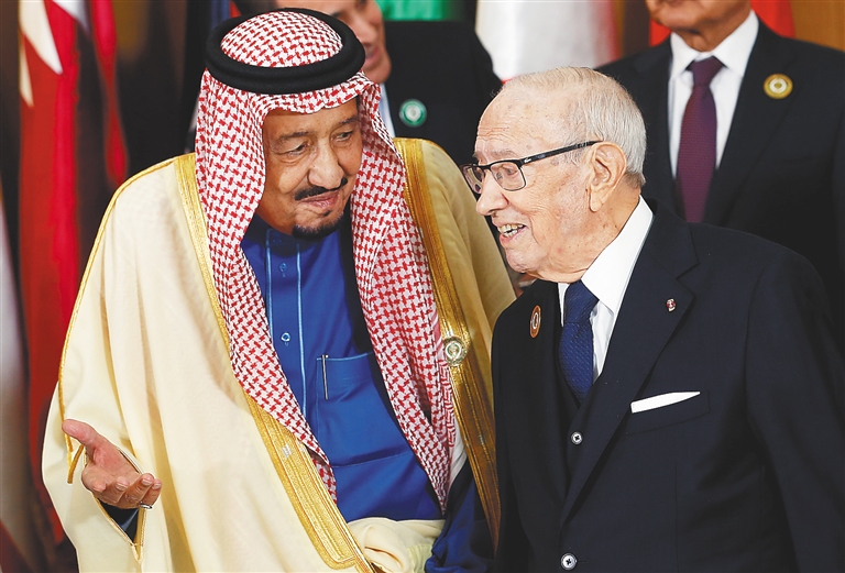 3月31日,在突尼斯首都突尼斯市,沙特阿拉伯国王萨勒曼(左)与突尼斯总统埃塞卜西在参加集体合影时交谈。