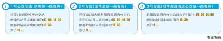 海口还设置园区临时免费摆渡专线,4月3日至5日安排公交车从颜春岭公墓园区入口周边停车场往返园区内,滚动发班,为祭扫市民提供免费公交摆渡服务。加大57路(外滩中心至海南生态软件园)、59路(火车东站至海口综合保税区)2条常规公交线路发班密度,线路运营站点及票价不变。