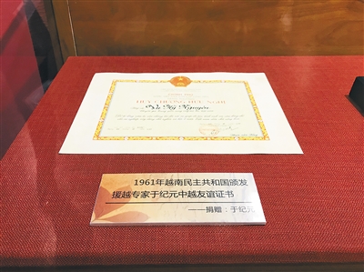 海南农垦博物馆玻璃展柜内,存放着一张已故的越南领导人胡志明在1961年向于纪元颁发的中越友谊证书。这是对于纪元支援越南植胶、圆满完成国家援外任务的肯定。