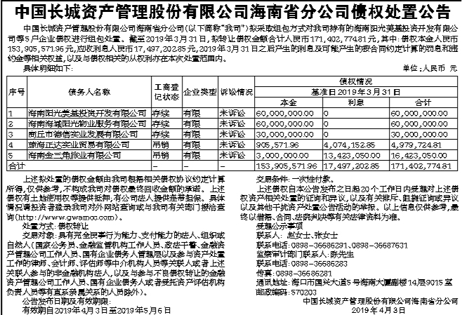 中国长城资产管理股份有限公司海南省分公司债权处置公告