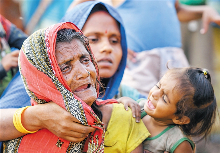 4月1日,在尼泊尔巴拉区,人们悼念在风暴中丧生的亲人。尼泊尔南部3月31日晚遭受风暴和雷电袭击,目前已造成至少20余人死亡、数百人受伤。 新华社/美联