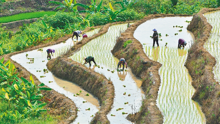 近日,五指山市毛阳镇牙胡村的村民正在梯田里插秧,一派忙碌的春种景象。通讯员 尹辉 摄