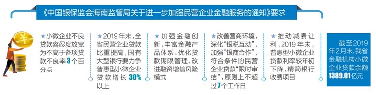 信贷准入门槛高、融资难度大,这是民营企业普遍反映的融资难题。为此,海南银保监局在“优化服务体系,强化服务保障”方面提出多项要求,包括强化服务体系保障、信贷政策保障、激励机制保障、尽职免责制度保障,进一步将小微企业不良贷款容忍度放宽为不高于各项贷款不良率3个百分点。要求确保到2019年末,全省民营企业贷款户数持续增长,在新发放公司类贷款中,民营企业贷款的比重进一步提高。其中,国有大型银行要力争总体实现普惠型小微企业贷款要增长30%以上。