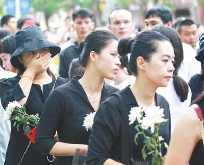 本号镇福和希望小学美术老师吉亚军带着7岁女儿和3岁儿子挤在队伍前面。他告诉孩子要记住今天,记住博英哥哥,他是英雄,为国家献出了生命。