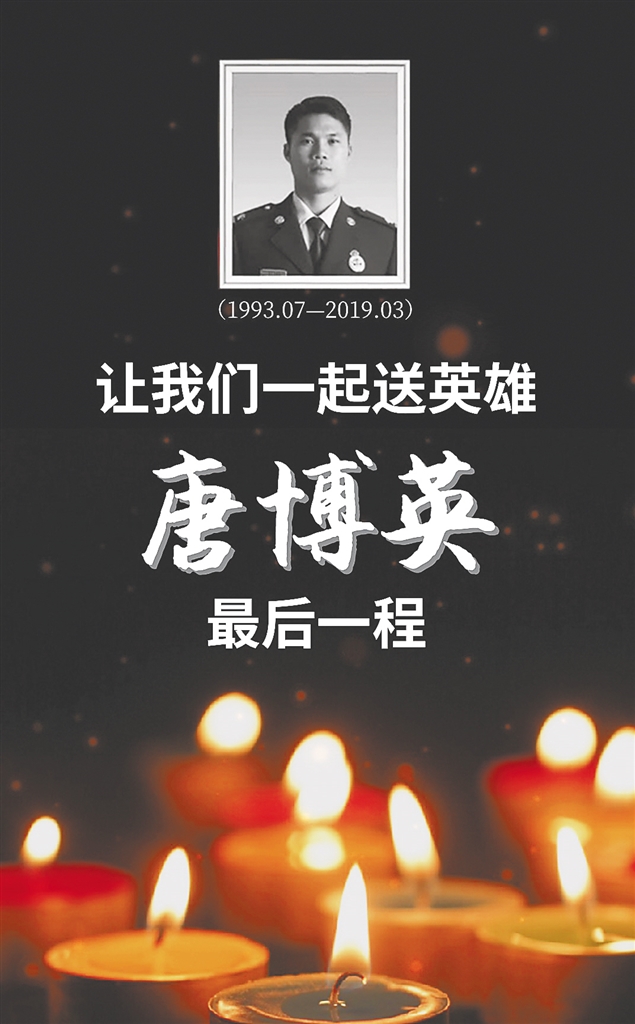 红如烈火的红掌、洁白纯净的百合、轻盈绽放的勿忘我……唐博英烈士的骨灰盒安放在鲜花拥簇的灵堂上。遗像里的他身着军装,笑容腼腆。“敬业爱家赤诚忠心,力降火魔浩气长存”,十六个字挽联高度概括了他26岁的生命。
