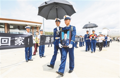 “唐博英烈士,我们接你回家。”在航班到达前一个小时,干部群众、官兵等人员就已在三亚凤凰国际机场分两排站立,拉起横幅等待。烈日下,礼仪兵用庄严的步伐向英雄致以最崇高的敬意。