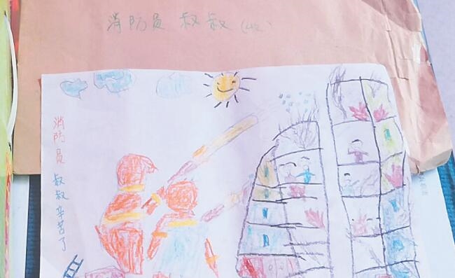 4月4日下午4时许,海口龙华消防大队金融中队来了一位5岁左右的男孩。他在母亲的陪同下来到中队门口,将一个塑料袋放在岗亭。当值班人员上前询问时,男孩庄重地敬了一个礼。“这是孩子送给你们的,向你们表示感谢。”男孩的母亲对值班人员说。经工作人员清点,男孩送来的礼物包括一箱饮料和两袋果冻。让人感动的是,塑料袋中还有一幅男孩画的彩色画,上面画着两名消防员举着水枪灭火的场景,旁边一行稚嫩的文字写着“消防员叔叔辛苦了”。
