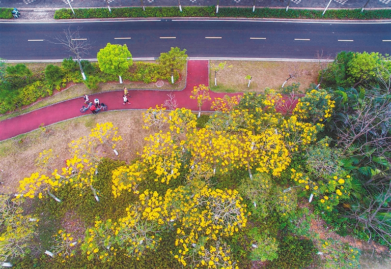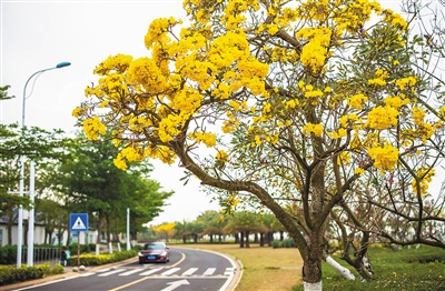 在三亚迎宾大道干沟段的中间绿化带上,黄花风铃木排成列,和其他绿植连成一段赏心悦目的分隔线,在左右经过车辆的车窗上投下倩影;在儋州市雅星镇到白沙黎族自治县路段,枝干尚显青葱的黄花风铃木,嵌在婆娑绿影中,随风摇曳……