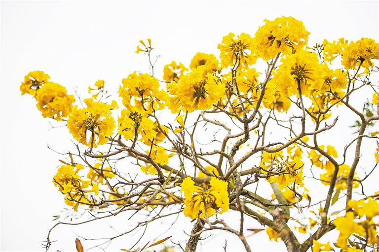俗语道“红花当然绿叶配”,对于黄花风铃木而言,这句俗语显然不适用,它既没绿叶也没红花,只有光秃秃的枝桠和黄灿灿的花朵。