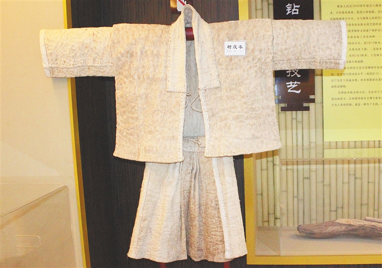 黎族还有一种“无纺布”,顾名思义就是不用纺织,而是用树皮制成的。《山海经》中“绩木皮为布”的记载,指的就是黎族树皮布的制作工艺。保亭黎族苗族自治县民族博物馆馆长陈玉林介绍,树皮布的加工步骤为:扒树皮、修整、浸泡脱胶、漂洗、晒干、拍打、缝制成衣。