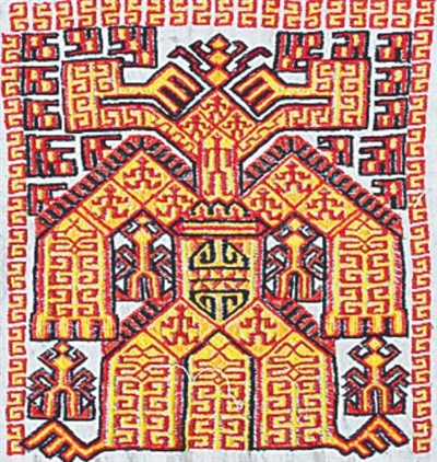 不同黎族方言的织锦人形纹各有特点,哈方言主要以大型人纹(如婚礼图)及叉腰人纹为主;杞方言以多个排列的小型人纹为主,与赛方言织锦人纹一样带有蛙的意味,体现古老的蛙崇拜意识;润方言人纹以大型祖公纹、祖崇纹为主,配以小型的蛙纹样,真实体现了祈求人丁兴旺的意愿;美孚方言的人纹为抽象的,同样带有蛙的特征和蛙崇拜意识。