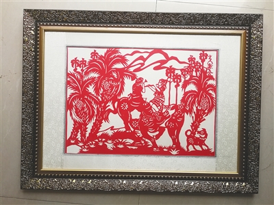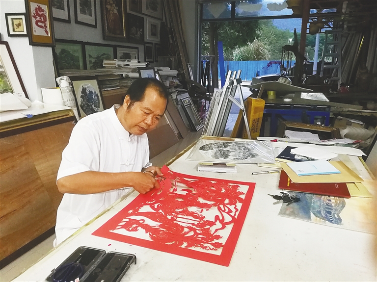 在昌江黎族自治县石碌镇的一间画室里,47岁的剪纸艺术家周烨手中铁剪飞舞,几把刻刀“笔走龙蛇”,一张平常不过的红纸,就成了反映乡村闲适生活的风景画。