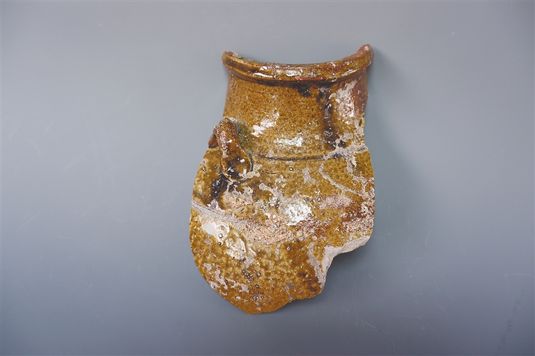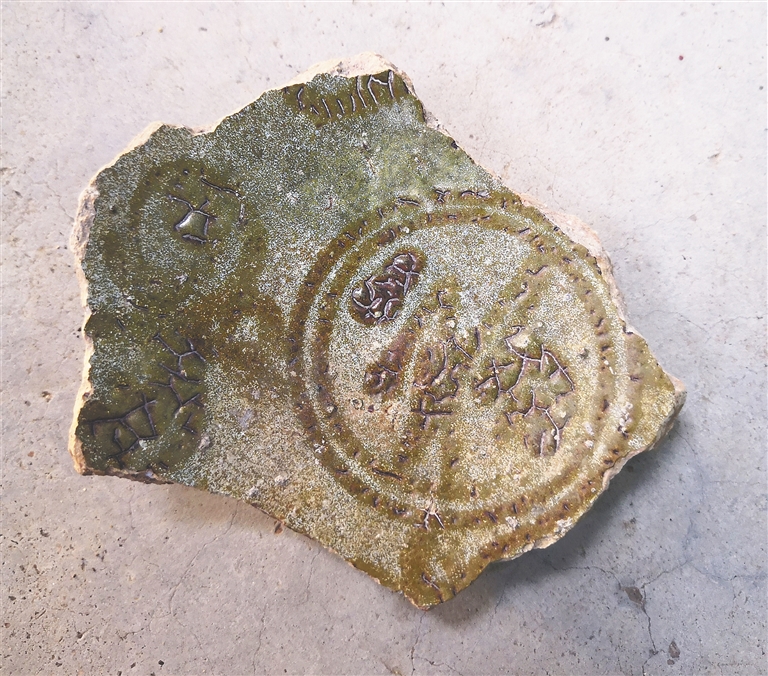 从实际的调查来看,三曲沟窑址可能明代以前就有陶器烧造。在新民村村民的家中,我们见到了一些从窑址捡拾的陶瓷残片。其中一块“福”字款釉下褐彩的盘底,与广东宋元时期雷州窑烧造的釉下褐彩瓷器极为类似,也不排除这本是雷州窑的产品,越过琼州海峡贩卖至此。“福”字位于残片的盘心,周边是一些类似花卉的纹饰,釉子施的并不均匀,胎质倒是接近于瓷胎,与宋元时期的磁州窑那种质朴自然的民窑风格倒也一致,只是这种褐彩颜色较淡,釉子发绿,比不得磁州窑那种黑白对比的美感来得强烈。