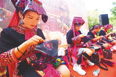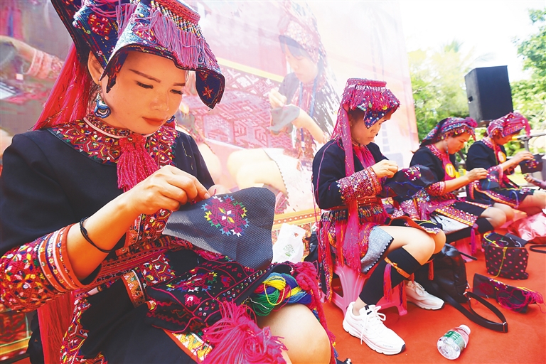 4月6日,三亚市黎族苗族同胞欢聚一堂,进行黎锦、苗绣技艺展示及比赛,迎接传统节日“三月三”。图为参赛选手在进行苗绣比拼。