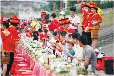 黎族千人长桌宴是黎族宴席的最高形式与隆重礼仪,已有几千年的历史。长桌宴宴席长条桌排开,上面盛着三色饭、小鱼干、竹筒饭、腌肉脯、山兰酒等当地特色美食。