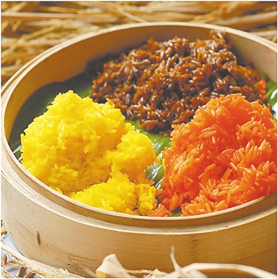 三色饭是海南苗族独有的食品,三色饭是用山兰糯米、枫树叶、红兰草、黄姜、小山棕叶若干包制用专制的木桶蒸煮而成,具有红、黑、黄三种颜色。