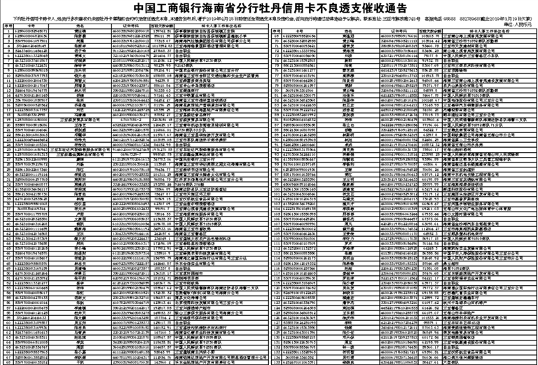 中国工商银行海南省分行牡丹信用卡不良透支催收通告