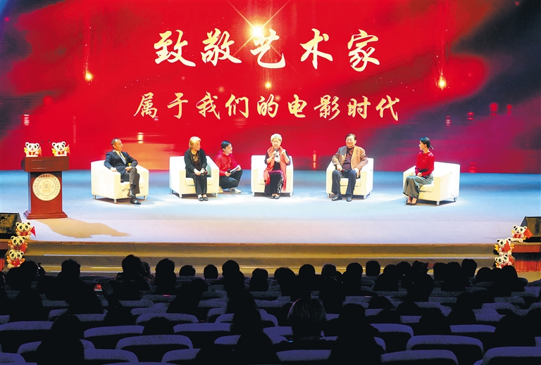 4月7日,第二十六届北京大学生电影节在北京师范大学开幕。本届电影节于4月7日至4月28日期间举办,期间有影片展映、学术交流研讨会等多项活动。图为开幕式上,表演艺术家陶玉玲(右三)、祝希娟(左二)、翟俊杰(右二)、颜丹晨(右一),导演梁明(左一)与现场观众互动。