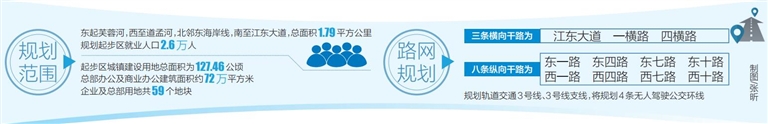 规划设计方案明确,起步区发展将坚持共生、共融、共享的规划理念,建设走向世界的先锋之城,打造全球领先的生态CBD。规划范围东起芙蓉河,西至道孟河,北邻东海岸线,南至江东大道,规划起步区就业人口2.6万人。
