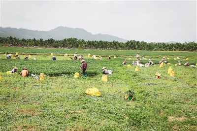 近日,我省多地天气持续晴好,各地农民抢抓农时,趁着好天气积极做好耕地农田管理。图为琼海市博鳌镇农民在抢收毛豆。