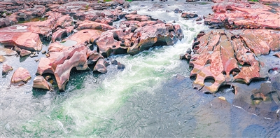 群石奇特怪异状如兽,表面光滑多窍孔卧在河床上,寻常的河水因此变得灵动,一股股细流穿梭于群石间,狭路汇聚处湍急不已,激起欢腾的浪花。图为海垦长征农场乘坡分场万泉河石臼群。文/海报集团全媒体中心记者 吴思敏 图/许欢