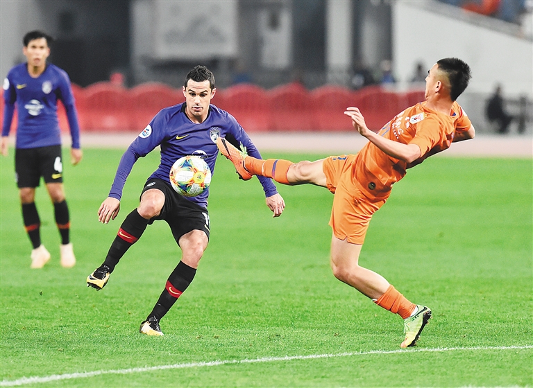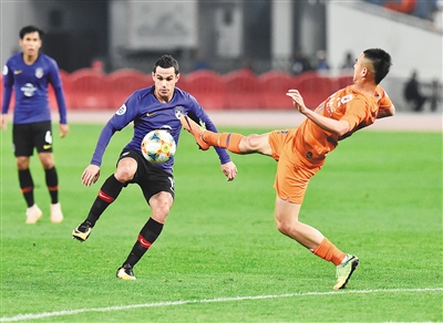 4月9日,山东鲁能泰山队球员刘彬彬(右)在和马来西亚柔佛DT队的比赛中拼抢。 新华社发