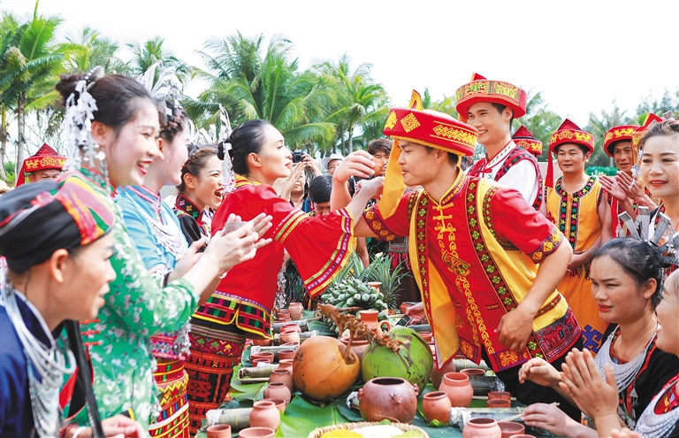 4月9日上午,兼具现代与传统的黎族风情婚礼活动随着一曲悠扬的大合唱《真诚的美丽》在光坡镇香水湾拉开序幕。