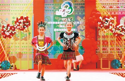 在海南黎族传统婚礼服饰展示秀中,表演者们向观众展示了极具特色的民族服饰,衣服上的图案精美,多以人物为主,描述了黎族百姓在举行婚礼时的各种活动,主要分为“迎娶”“送娘”“送礼”等故事情节。