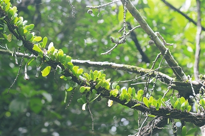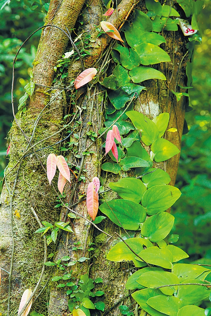 “其实,这些黄金索叫海南藤芋,是附生在大树上的海南藤芋悬垂下来的根,但能长成这么多、这么长、这么粗,也得有几十年了。”黄青良介绍,海南藤芋在海南中部各林区较为常见,但长得这么壮观的却是很少见。略显遗憾的是,这棵古树枝叶太高,种类繁多的附生植物又将其枝干遮掩得严严实实的,这也让黄青良一时难以辨别其具体种类,但他认为应是青藤公或是其近似种。
