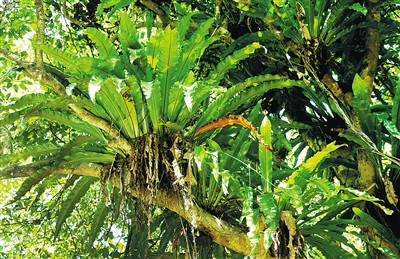 在百花岭中,人们随处能看到多姿多彩、趣味横生的“空中花园”景象,附生植物鸟巢蕨、肾蕨、崖姜蕨、槲蕨、书带蕨、附生兰花、鹅掌藤等在风中摇曳,散发着生命的活力。“空中花园”最集中的区域,非菩提湖周边莫属。那里有很多高大的枫香树,有些树上长着十几个鸟巢蕨,阳光之下透着嫩绿,非常好看。