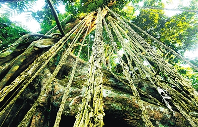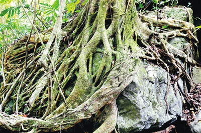 绞杀现象是这道原始森林中奇特的景观,在百花岭热带雨林中比比皆是。