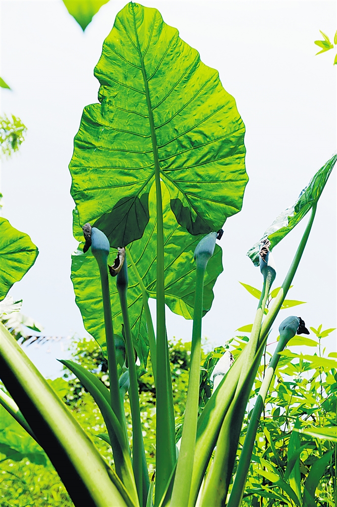 如果你经常行走在海南中部山区的田间地头,你会发现许多山里的村民在雨天不穿雨衣、不带雨伞,而是头顶着一片硕大的海芋叶。这些硕大的叶片,直径有一米多,常常被村民当成生态雨伞来使用。