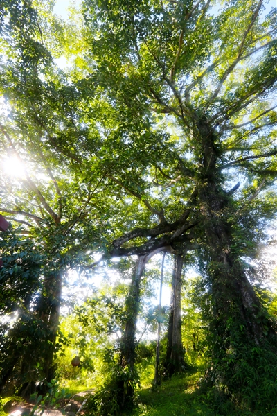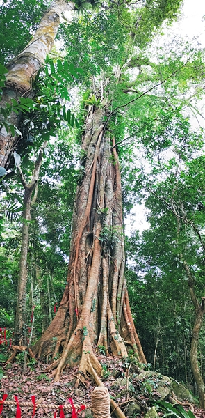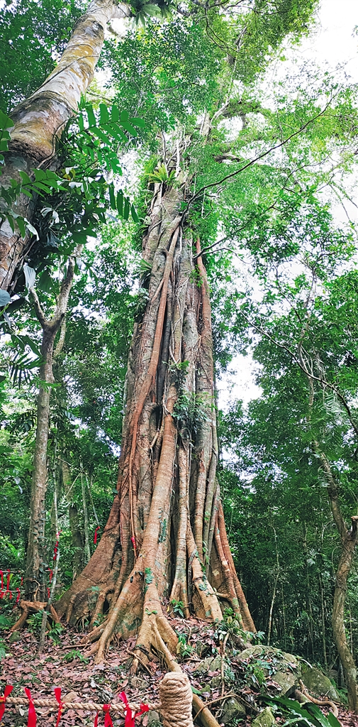 在百花岭的观音寺前,有两棵上百年树龄的古榕树。其中,一棵高山榕树高30多米,树幅面积达200多平方米,从树上垂下的须根如今已经深深扎在土中。它们和树干一起吸取大地养分,成为雨林中的一大奇观。
