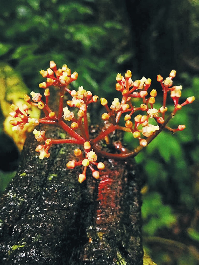 老茎生花的原因是什么?原来,大多数植物的花朵都需要昆虫为其授粉才能结出种子,繁衍生息。但是,在热带雨林中,昆虫和其他授粉者主要在林冠下特定的高度范围内活动。成年乔木的枝叶通常很高,如果花开在很高的地方,授粉者可能看不到、够不着,所以老茎生花现象就应运而生了。树木将花朵开在接近地面的树干上。在那里,花朵很容易被昆虫等授粉者注意到,能获得更多的授粉机会。除此之外,“茎花”还有利于植物输送养分,减少能量的消耗。