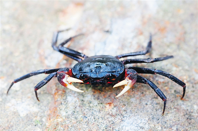 与灵活的蛙类不同,龟类往往靠将脑袋缩进壳内躲避危险,可生活在百花岭山涧中的平胸龟却是个例外。因龟壳扁平,脑袋又长得不合比例的大,平胸龟的头只能直挺挺地伸在壳外,幸好它的“牙口”足够硬,各种鱼虾螺贝自不用说,一些蛙类也是它们的猎食对象。