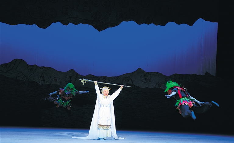 《冼夫人》一剧在舞台美术方面也可圈可点。展示冼夫人曾生活、战斗过的岭南地图作为主背景铺设开来。威武战车缓缓“驶”入舞台中央,映衬冼夫人英姿。吊威亚等现代技术也被运用在剧中。
